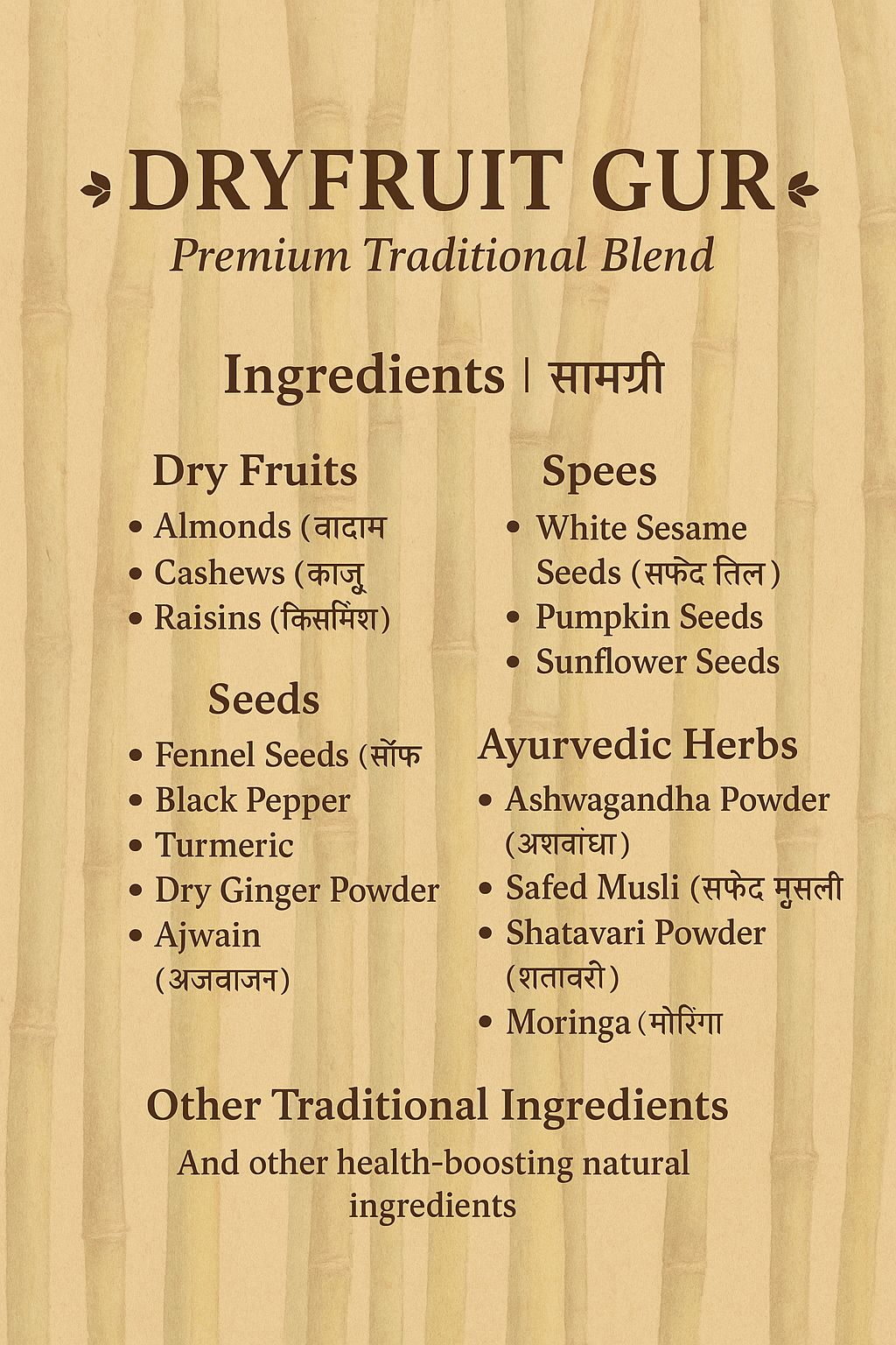Experience the richness of tradition with our Dry Fruit Gur – Premium Traditional Blend. Crafted with the goodness of almonds, cashews, raisins and nutrient-packed seeds and herbs, this gur offers delicious sweetness with natural health benefits in every bite.